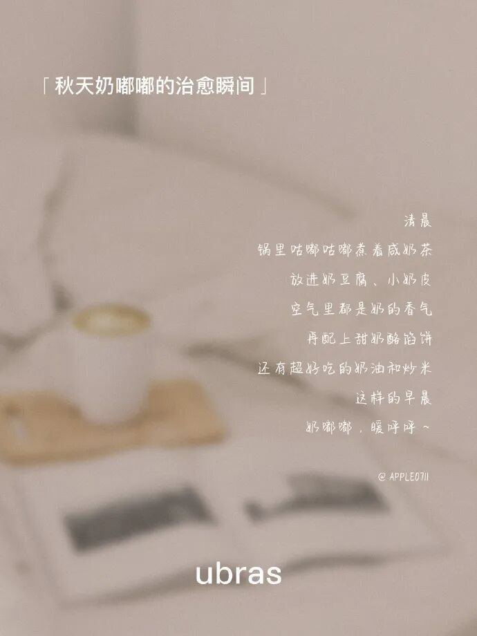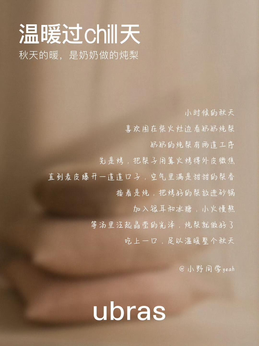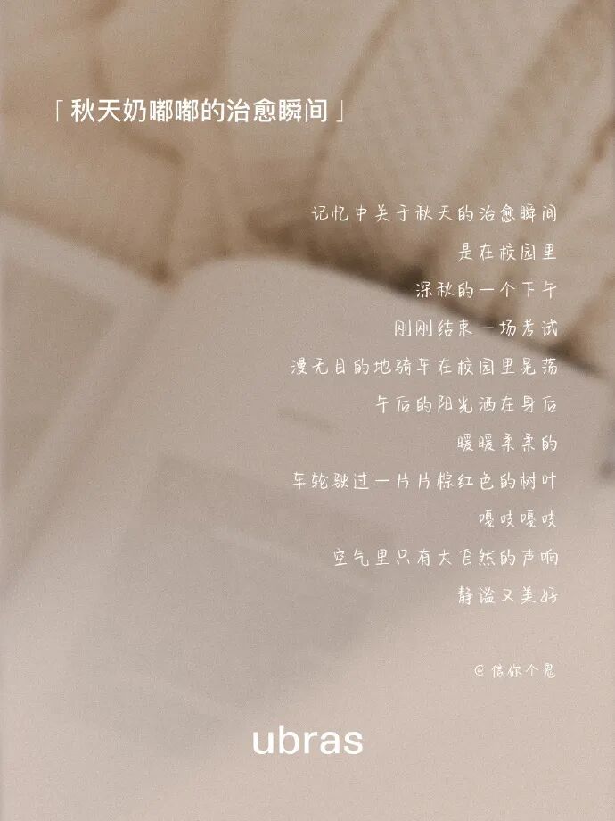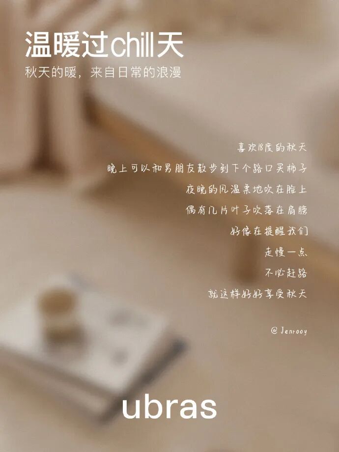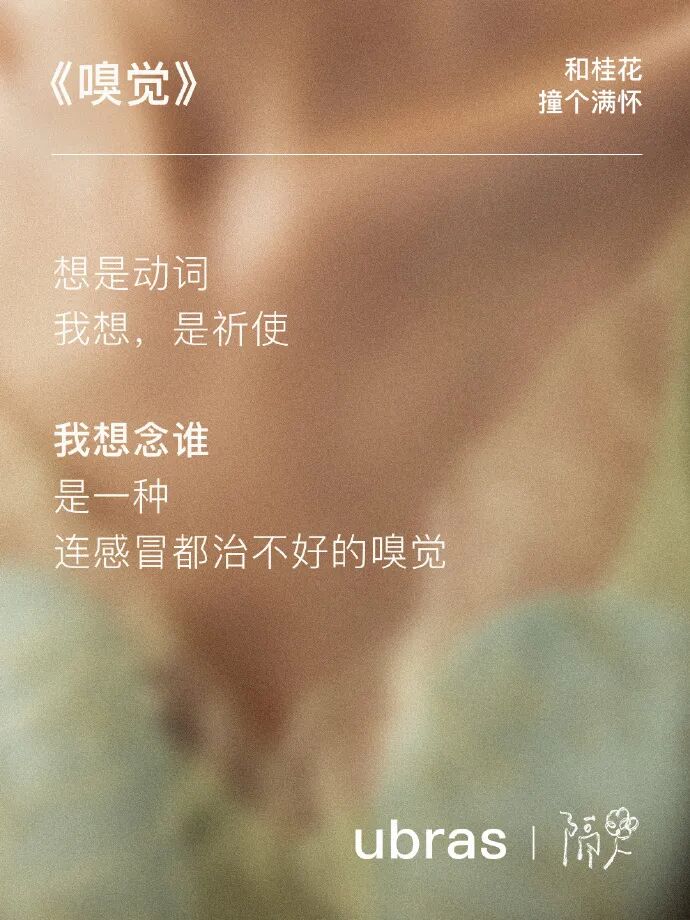 对于打工人而言,是通勤地铁上让人起鸡皮疙瘩的冷气,是午后小困也不加冰的温热奶茶,是夕阳西下办公室窗外飘落的秋叶……这些生活中的细碎瞬间,总让人第一时间感知到秋天的来袭。随着秋意渐浓,品牌纷纷吹响秋日营销的号角,或是借秋景抒乡愁,焕发用户的心灵共鸣,或是季节性上新,开启秋天的正确打开方式,邀请用户一起走进品牌的秋日世界。ubras则是两者兼备,推出国风金桂、奶嘟嘟、温暖过chill天等秋日新系列,用文案给产品注入秋天的诗意,将秋色玩出了新花样。ubras联合小红书上走红的野生诗人「隔花人」,为桂花系列作诗,围坐在桂花下,将诗意穿在身上,包裹一场不限花期的想念,拉满秋日氛围感,给产品平添几分秋色。5首随笔小诗,以秋日里的感官情绪为出发点,道出了秋天所承载的乡愁、松弛感、轻盈等等多面感受。简单的笔触勾勒出人们眼中不同的秋日景象,同时也将ubras桂花限定新品的轻盈重量、无尺码、舒适感等产品卖点一一释出,自然又不显突兀,用秋意衔接相当巧妙。在金桂系列设计理念的阐述中,ubras把桂花视为秋天的“代言人”,代表着乡愁和想念,给产品赋予情感灵魂。以此唤醒人们的秋日记忆,建立新品与秋天的缕缕强关联,将秋意藏于每一件贴身衣服中,用秋日“添衣”传递爱和温度。为了强化品牌的温度,让用户具象化感受秋天的温暖,ubras向用户征集秋天文案,分享秋天带来的温暖记忆,进一步加深用户对品牌的形象和认知,拉近与用户的心理距离。爱上秋天,不仅仅是怀念记忆深处的秋日记忆,惬意温柔的秋风、簌簌飘落的秋叶、以及恰到好处的柔和阳光,都让人倍感治愈,宛如一处能量补给站,舒缓人们紧绷的神经,带来由心而发的松弛感。除了品牌诗歌和网友共创外,ubras的产品宣传文案同样饱含馥郁秋意,捕捉秋日里的温暖情景,以此类比产品的舒适功效,充满秋日意境之美。不需要华丽的辞藻,冗长的篇幅,寥寥几笔就能让人把秋天的柔和阳光、秋风吹拂泛起的层层涟漪等美好静谧的秋日场景,与ubras新品联系起来,潜移默化中植入用户心智。即使是简单的表情包搭配成语,也能从文字和画面中get到秋日专属的舒适感。可爱的充满网感的口吻,提升表达趣味,更能打动人心。纵观品牌的秋日营销战役,围绕桂花和秋日意境讲述的不在少数。ubras将两者完美融合,挖掘秋日里的治愈瞬间、温暖记忆等等,具象化诠释秋日景象,用文案实现广告移情,塑造品牌质感和底色,给人留下了深刻的品牌印象。