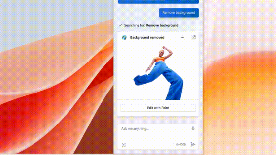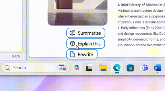 而Copilot则更像一个实干型的助手。比如你可以要求Copilot帮你“整理桌面”,它就会把窗口平铺排列;当你浏览网页的时候,可以呼出Copilot让它帮你总结、解释、重写网页的内容;编写文案、总结图表更是不在话下。更有意思的是,Copilot还具备对图片的处理能力,你可以在截图后直接让Copilot进行去除背景、抠出人像等操作。