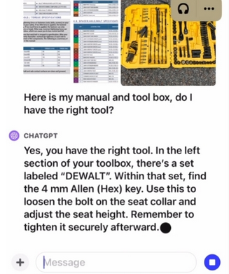 在官方给出的另一个例子中,用户给ChatGPT发送了一张自行车的照片,问它如何调低座椅。ChatGPT提醒用户查看车的型号,确认是有快拆杆还是用螺栓固定,并给出详细步骤。用户还是不明白,拍摄了座椅连接处的照片并圈出某部位,问这是不是快拆杆。ChatGPT识别出这是螺栓,并建议用内六角扳手。用户接着发难,拍摄了一张工具箱的照片,询问ChatGPT哪一个是内六角扳手,它也成功识别了出来。