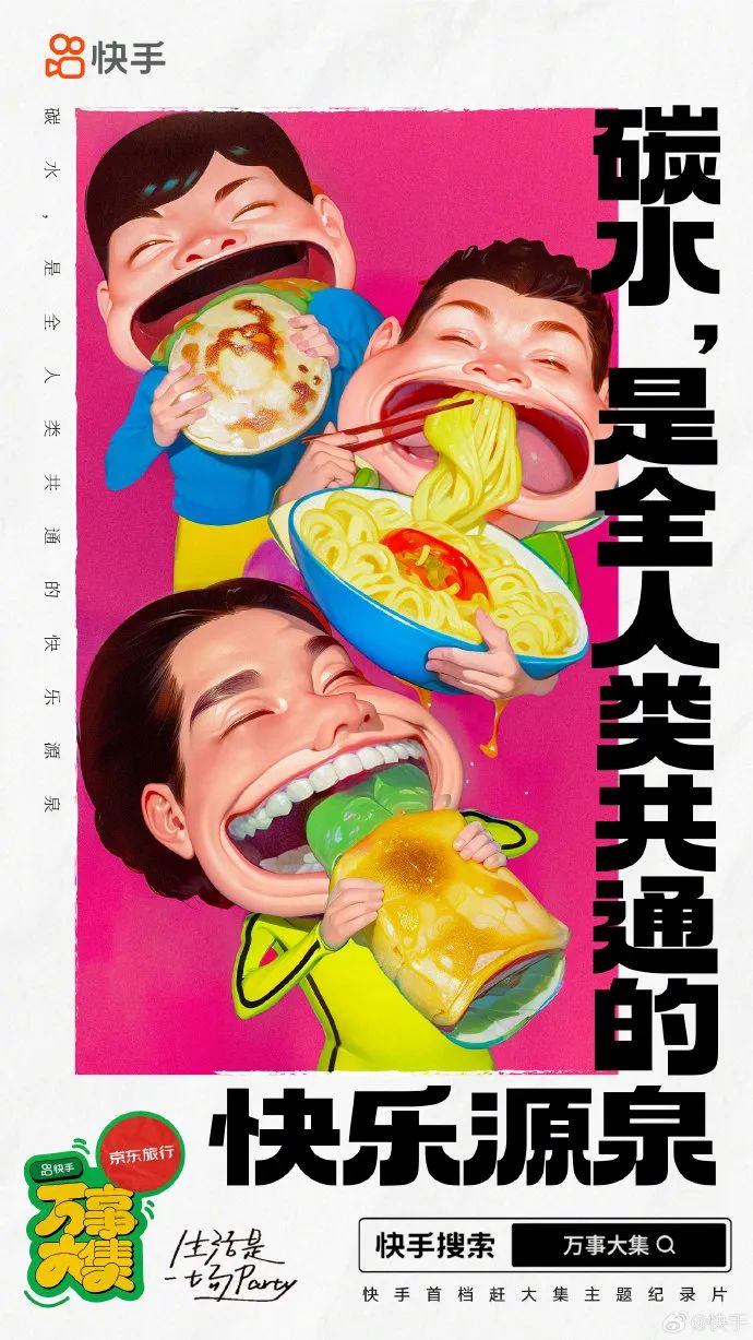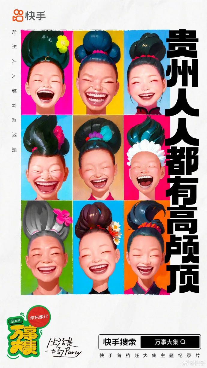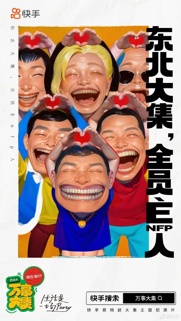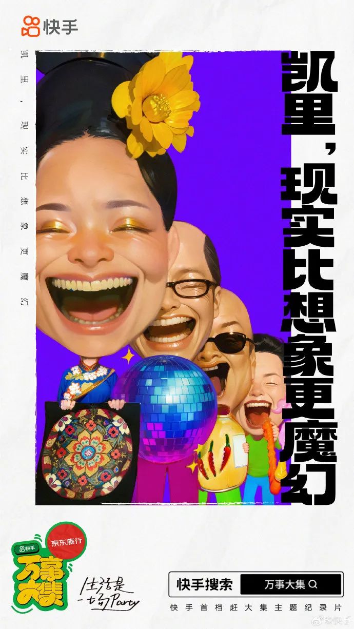 快手还结合时下流行的AI数字元素,推出一组赶集氛围海报,用先进的AI笔触,重新诠释传统的大集底蕴,新旧交织碰撞出不一般的火花。视觉上,统一的人物哈哈大笑定格画面,以极具冲击力的形式向大众传递赶集的快乐魅力,进一步深化“大集是生活里的一场party”的主题。