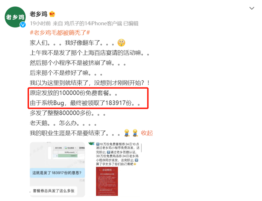 本来老乡鸡一共准备了10万份免费套餐券,结果一个“系统bug”,导致发出了18万份,这8万份如果按照正常售价计算的话,价值大概在400万元左右。