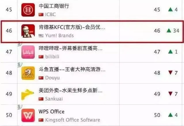 而这时候,肯德基这么一个美食类APP硬生生在一夜之间杀到了iOS热门App排行榜的前50名,把哔哩哔哩、斗鱼直播、美团外卖、WPS等软件都压在身下。