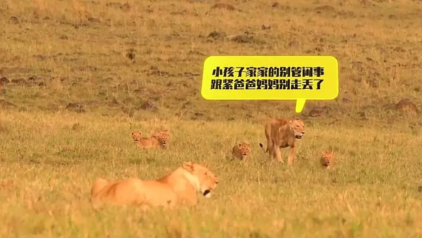 一群狮子宝宝跟在妈妈身后,突然发现狮爸爸不见了,但是母狮子表示非常淡定,因为爸爸有超能力!