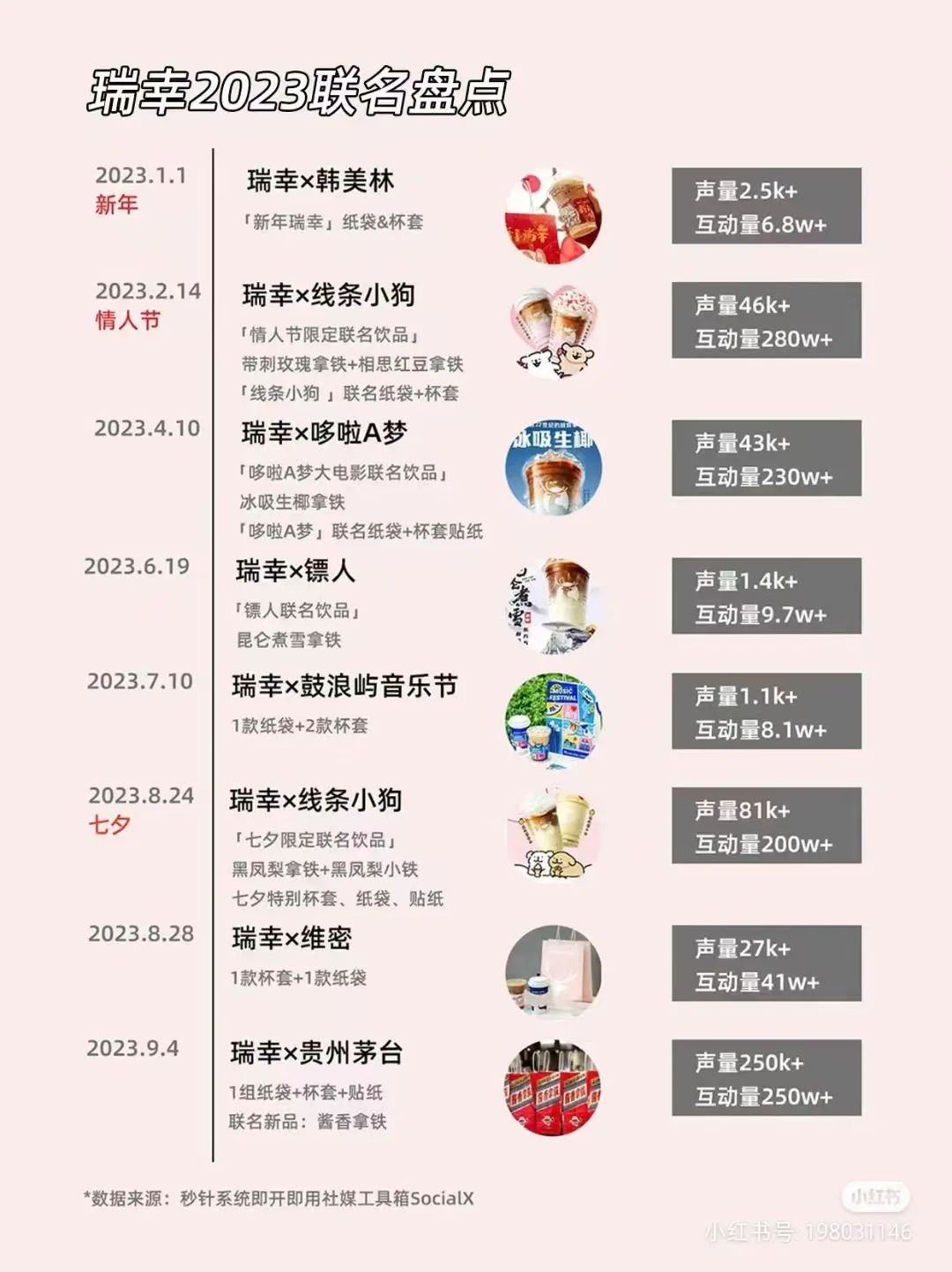 根据数据统计,瑞幸在2023年的联名有4次声量达到了40W+,互动量超过了200W!
