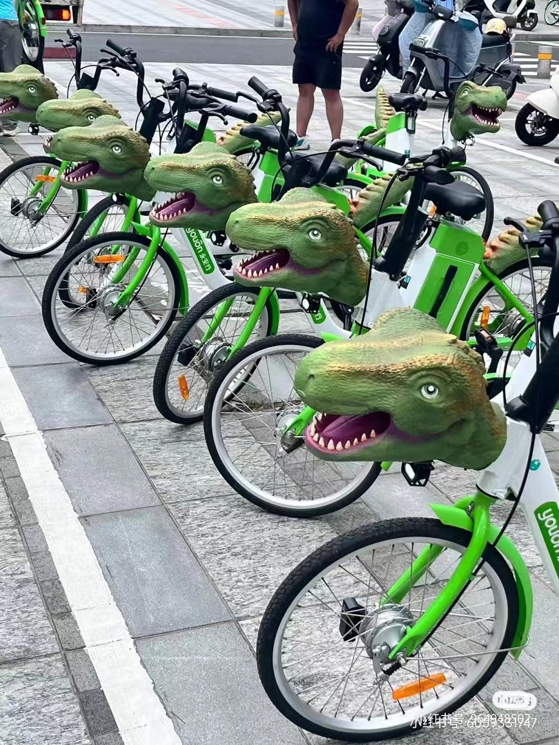 不过盘一盘,品牌在共享单车上搞事情也不是第一次了。都知道常州恐龙园很出名,没想到,人家遍地停着都是恐龙: