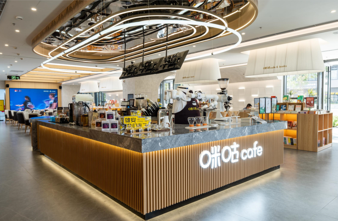 在雄安,看见未来的模样。进入门店,映入眼帘的便是采用原木、大理石搭配的360°环绕式咖啡吧台,以及模拟全球多位咖啡大师冲泡手法的全自动手冲机器人——AI咖大师。
