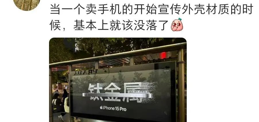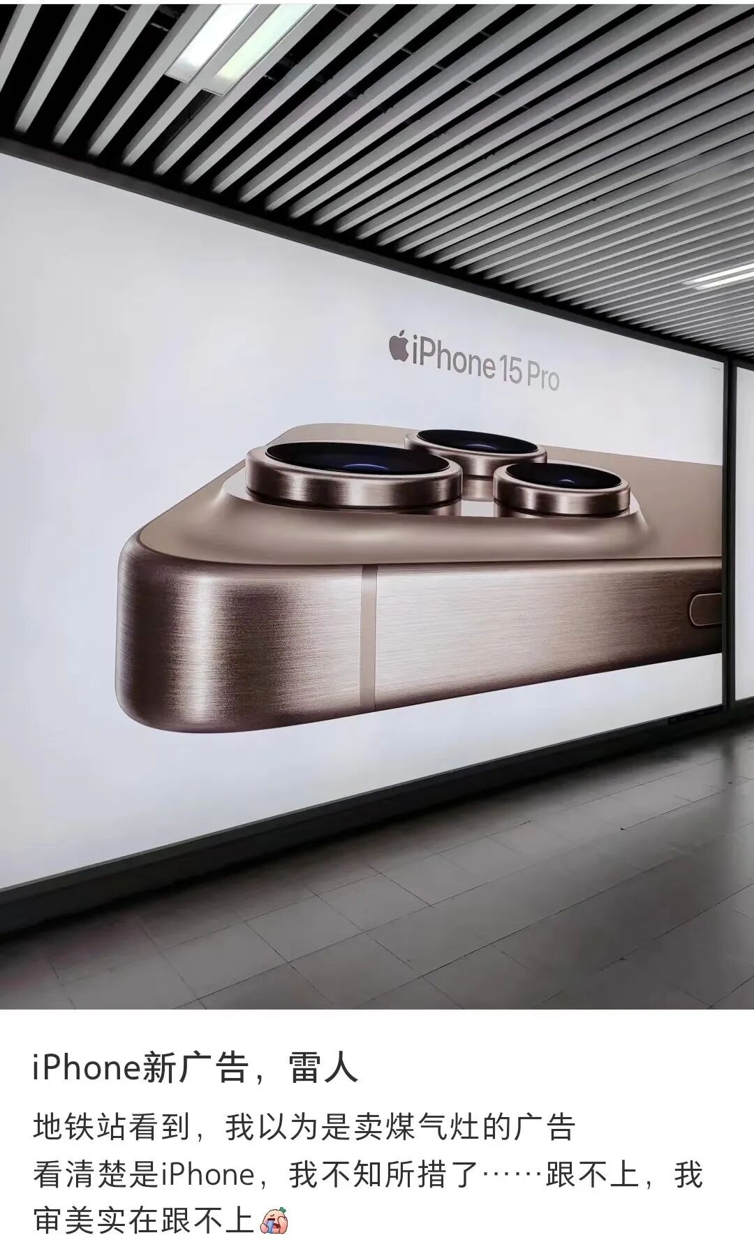 再这样下去,恐怕说“苹果要进军厨电行业”都有人信吧?不只是硬广设计槽点满满,iPhone系列的整体广告营销策略都被网友普遍认为“退步很多”。比如,当iPhone15的文案宣传重点放在“钛金属”材质上时,有人感慨“苹果是真的没落”了。