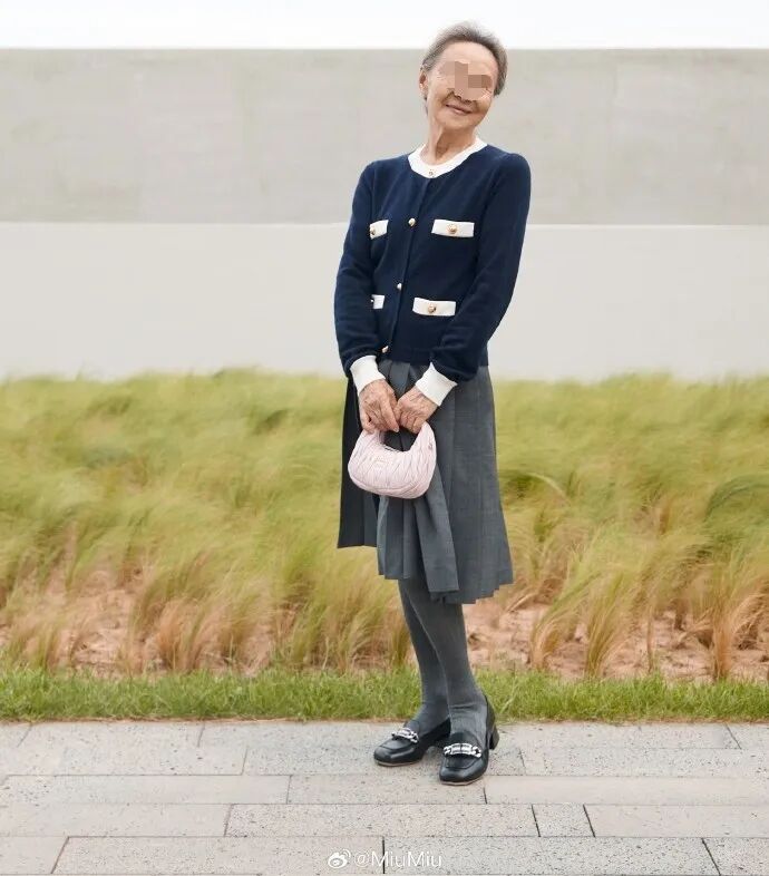 去年MiuMiu的秋冬套装,把深蓝色领毛衣、卡其裤和短裙、灰色西裤这些看起来是单位里的李阿姨张叔叔辈的穿搭,赋予了先锋时髦感,焕发时尚新生。