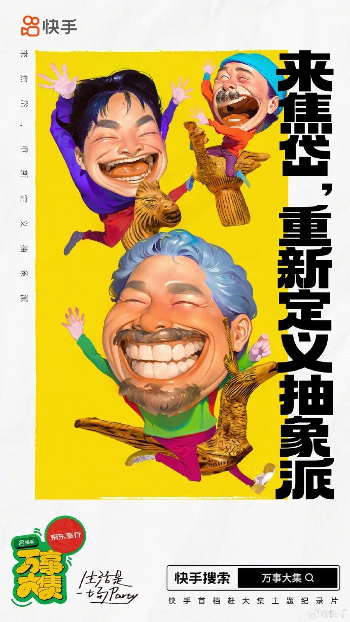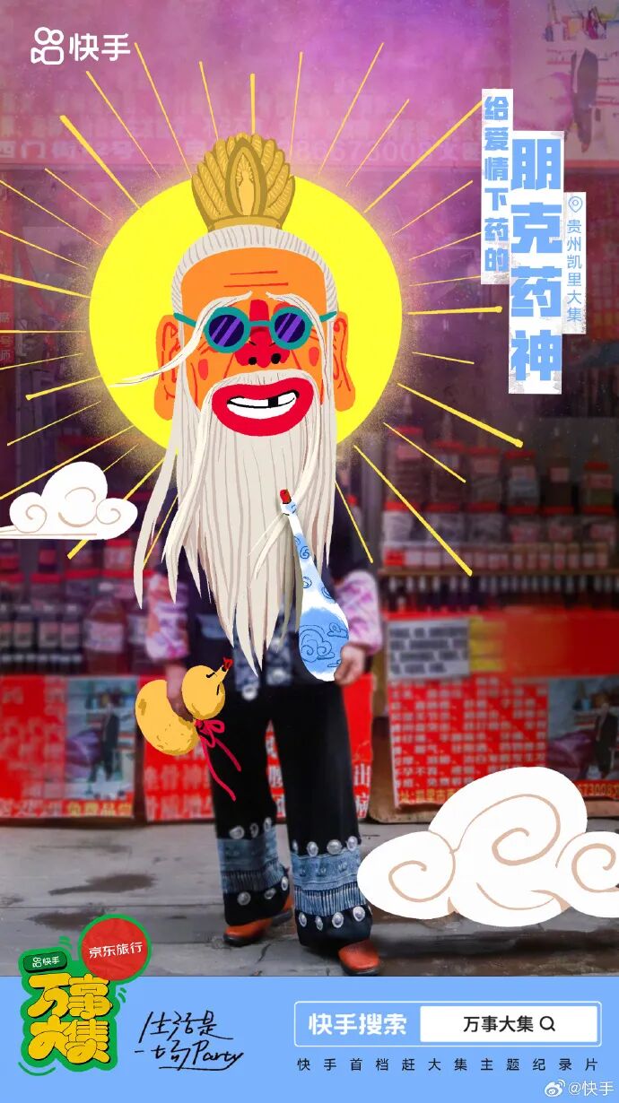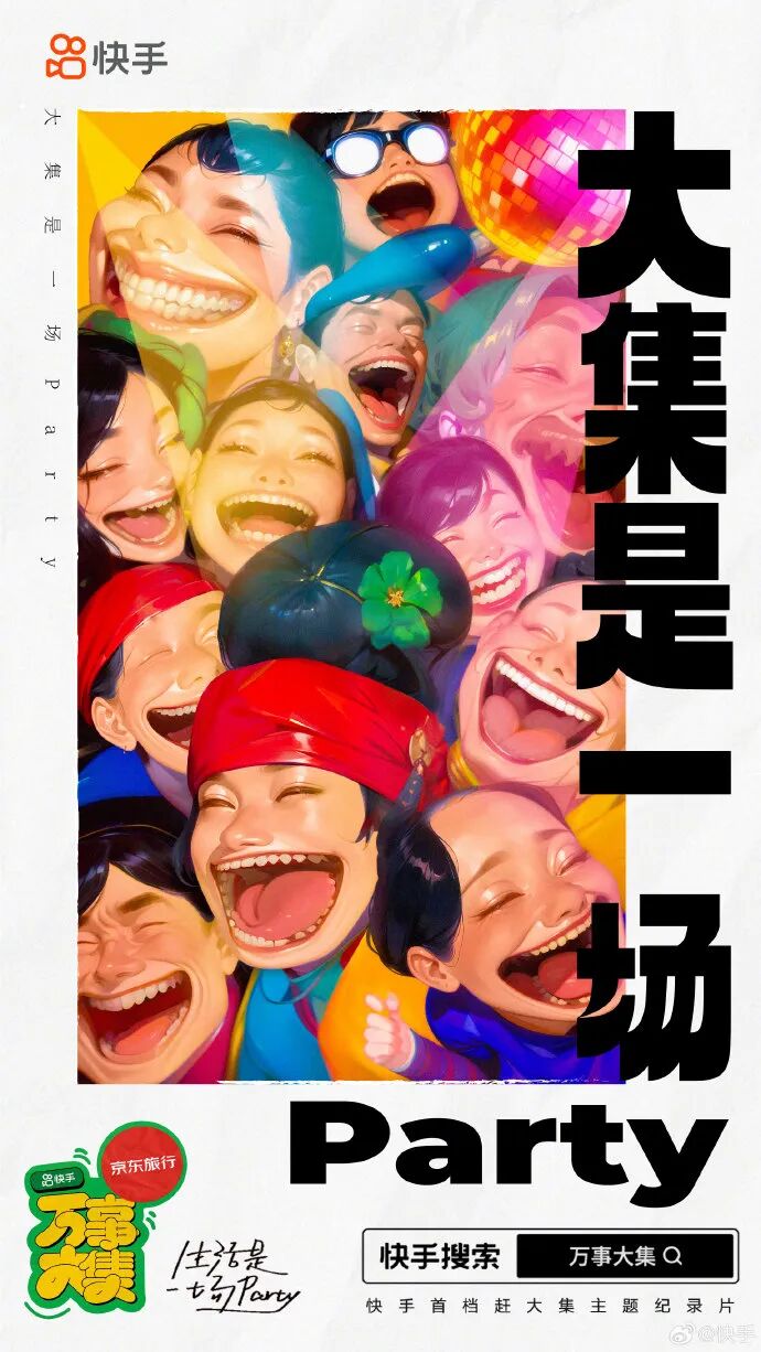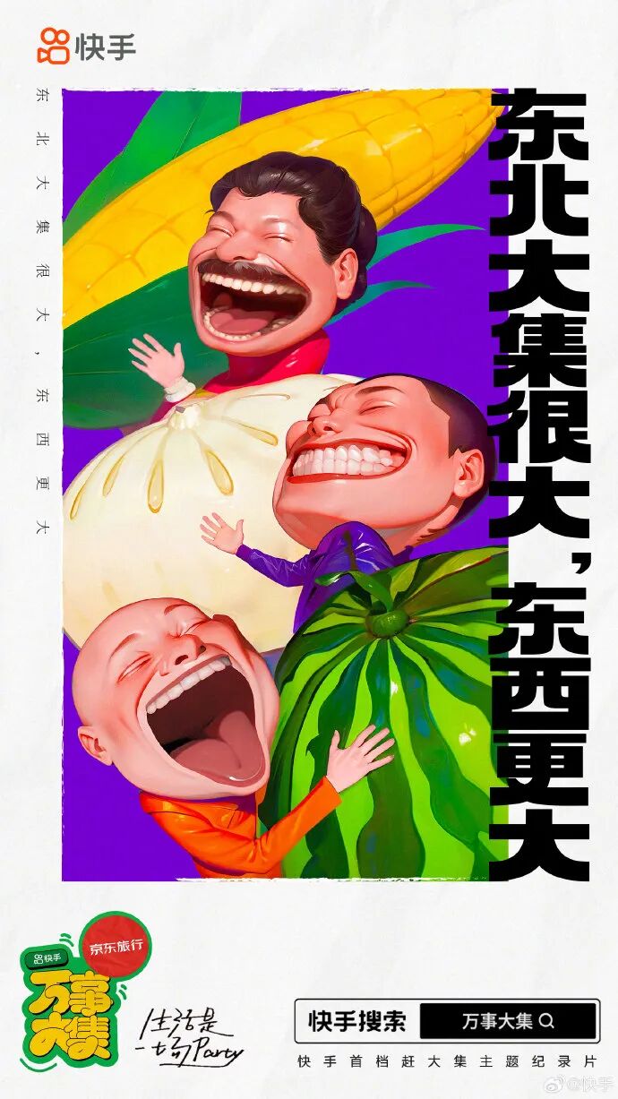 当然除了这些走心幽默的情感海报,快手的大集文案还有另一种画风,则是深挖每位摊主的有趣内涵,用搞笑的形式来打造人物海报,带给用户笑点的同时,也赋予这些集市更多有趣的玩法。在快手的脑洞大开演绎下,每位摊主都有自己的身份和特点,各式各样的人都赋予了这场大集更加热闹的属性,这也和快手想要传递给大众的“在大集这场Party中,热闹起来才是硬核道理”契合在了一起。而我们看这些海报,可以发现每个摊主都是隐藏的民间高手,有趣又好玩。甚至氛围海报,也是有趣值拉满,夸张的风格,开怀大笑的表情,深化“大集是生活里的一场party”主题的同时,也带给大众更多的欢快的情绪价值,主打一个热闹。可以说,人物海报和氛围海报看似都以夸张的形式进行演绎,但也间接消除了人与人之间的距离感,似乎每个人以及摊主都自带亲切感和熟悉感,这样传递出来的“当人与人不再保持社交距离,人间烟火才是回归日常最好方式”生活态度,也给高压下的年轻人带来别样的治愈。而快手的文案朴实温暖,也展现了普通人最真实的日常。它们不需华丽辞藻,但却充满人间烟火气和朴素美,却能依旧走心。