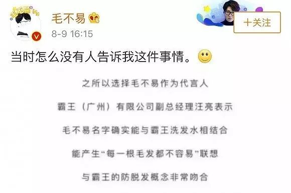 霸王洗发水选择毛不易作为代言人,也是结合毛不易名字梗能产生“每一根毛发都不容易”联想,这与防脱功能吻合。