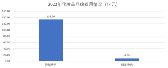 从我们选取样本数据中也可以看出,2022年8家上市化妆品品牌,花费的销售费用合计为133.70亿元,占总收入的比重为42.69%,远高于研发费用(8.60亿元)的占比(2.75%)。