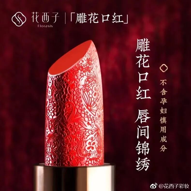 花西子将东方文化与时尚融合,推出一系列中国风产品,创新性地打造首款雕花口红,把东方花卉雕在口红膏体上。