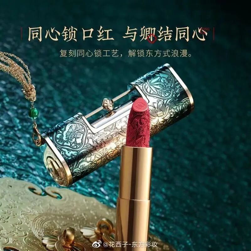 还从节日下手搞仪式感,为了迎合七夕气氛,以月老手中的三件法器(三生石、锦红线、同心锁)作为灵感,设计同心锁口红造型。
