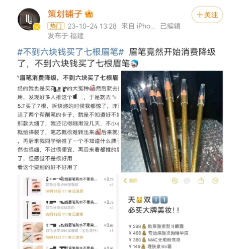 但"眉笔消费降级”和“反向消费”火了,有人分享不到6块钱买了7根眉笔。
