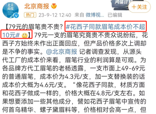 花西子被曝同款眉笔成本价不超10元。