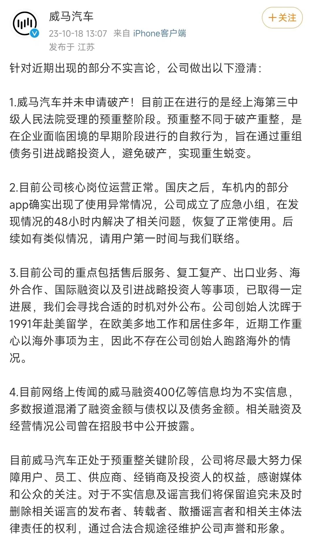 威马汽车同时指出,目前公司正处于预重整关键阶段,公司将尽最大努力保障用户、员工、供应商、经销商以及投资人的权益。