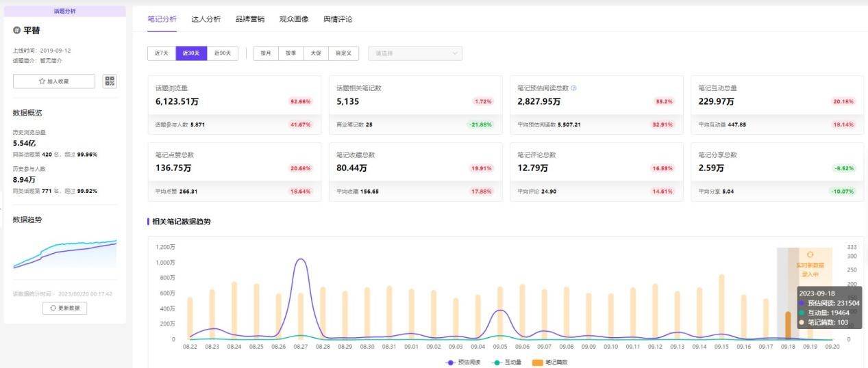 在小红书上搜索关键词“平替”,根据9月20日的数据显示,该话题浏览总量5.54亿,近30天话题浏览量超6000万,同比上一周期增长52.66%。其中,查看“平替”关键词近90天内的笔记互动量占比,穿搭位列第一,互动量高达1202.62万,占比37.52%,其次是家居用品、穿搭ootd、护肤、香水、彩妆、个护,分别占比7.45%、5.98%、4.50%、3.38%、3.16%、3.01%。