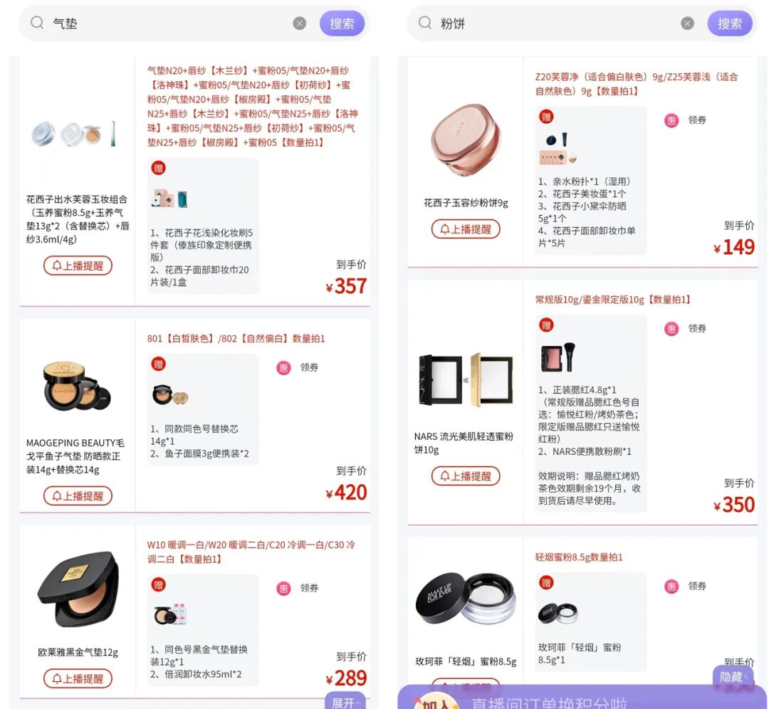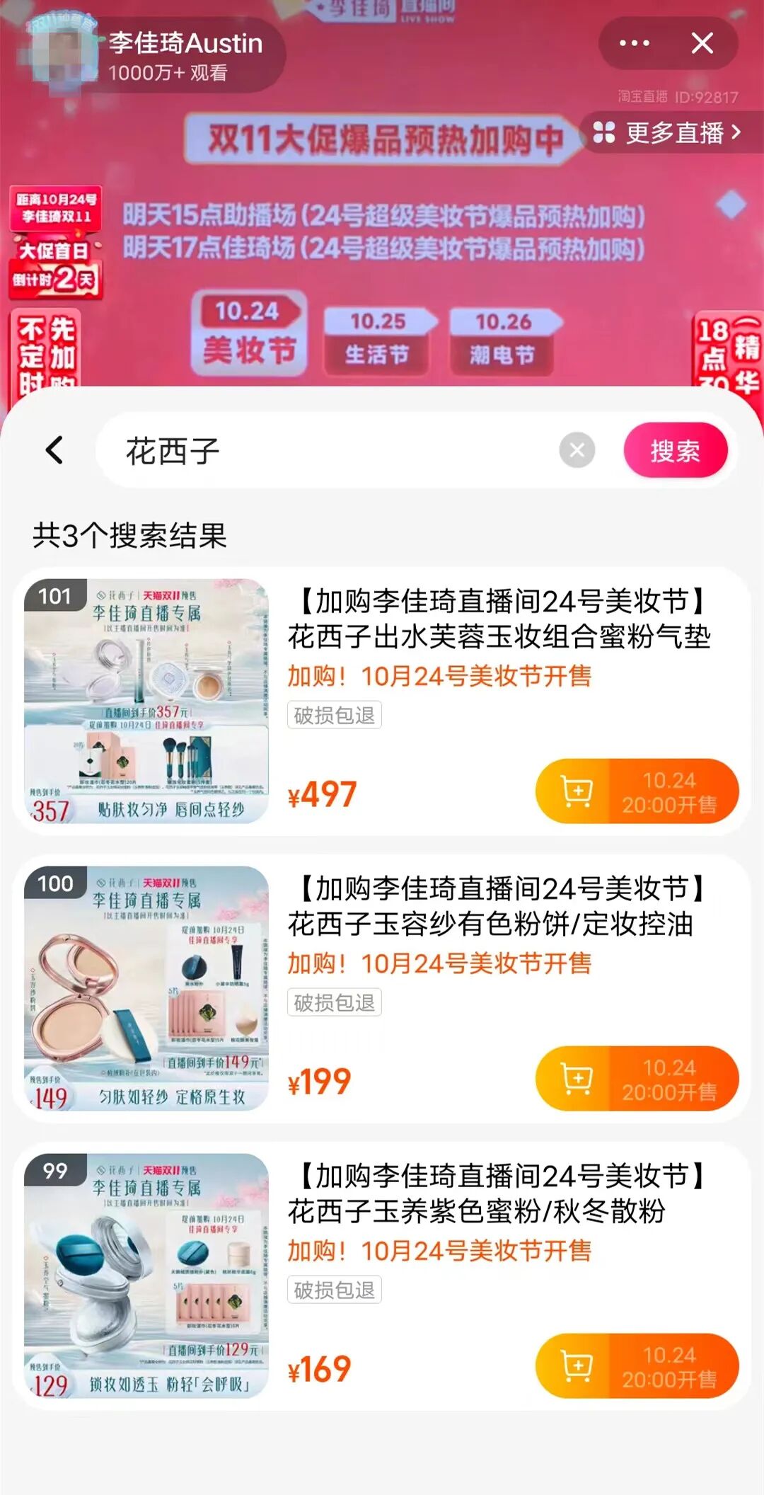 去某宝搜索李佳琦的产品预告,花西子虽然占了3个链接,但却没有一个是他本人讲解的,全都由其他工作人员代讲了。