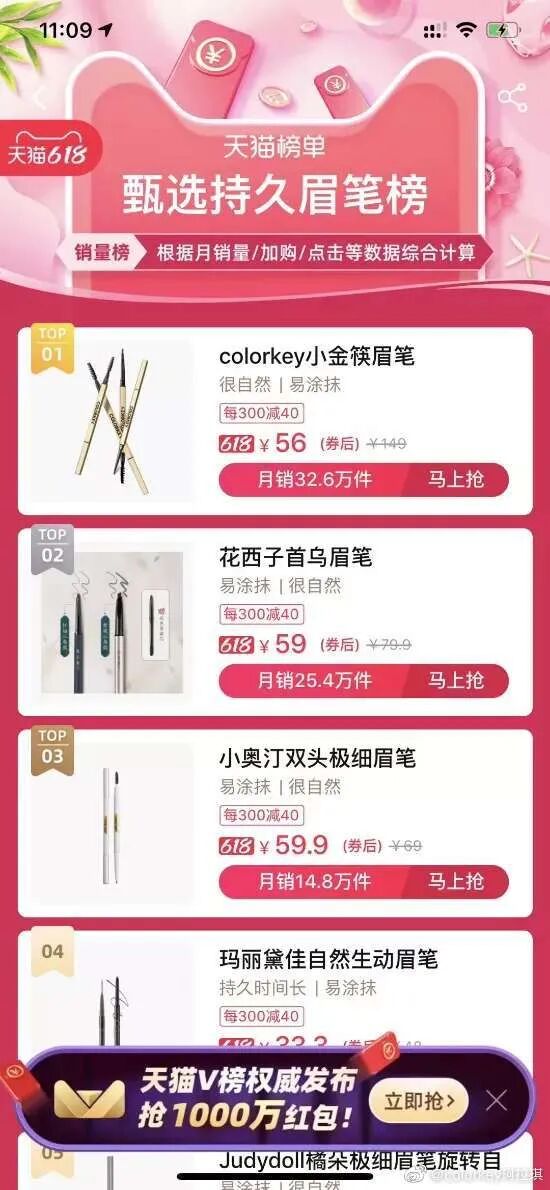 Colorkey珂拉琪“小金筷眉笔”新品上市的首月,月销30w+支,直接斩获了“天猫榜单——甄选持久眉笔榜”TOP1,而下面一位刚好就是花西子的首乌眉笔,官博还没打码。