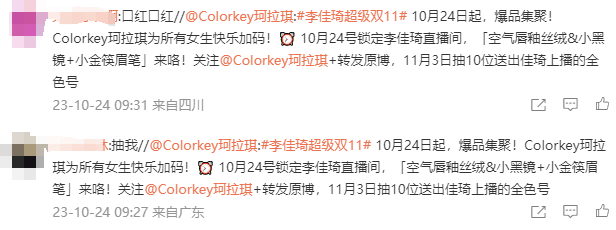 看着Colorkey珂拉琪,又是跟李佳琦官博互动,又是抽奖送眉笔唇釉的,感觉今年是带着很大的野心,想要销量再创新高。