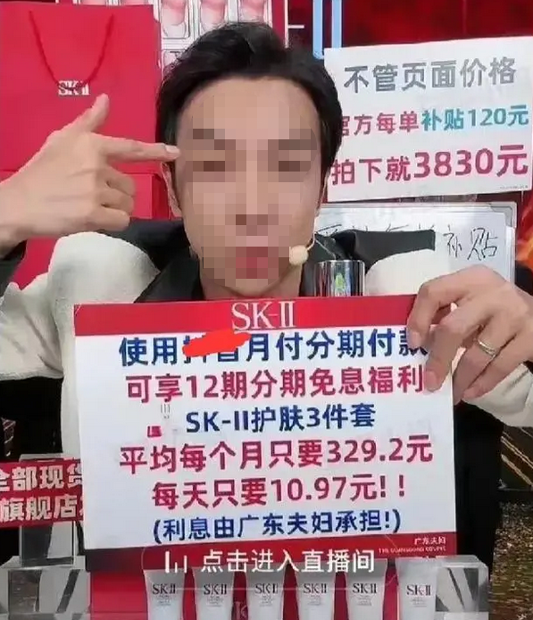 别说是品牌方,就连广东夫妇这种“网络销售”都能从中大赚一笔。那可不得使劲送iPhone,使劲吸引流量。正是这层原因,涉及到了我们开头所说的带货新思路,用分期付款“引诱”消费者下单。在网络流传的一张截图中,广东夫妇大狼狗郑建鹏在推荐某款高端化妆品时,举着一个牌子,上面赫然写着“使用某音月付分期付款,可享12期分期免息福利”,并且还在牌子的底下还写着“利息由广东夫妇承担”。