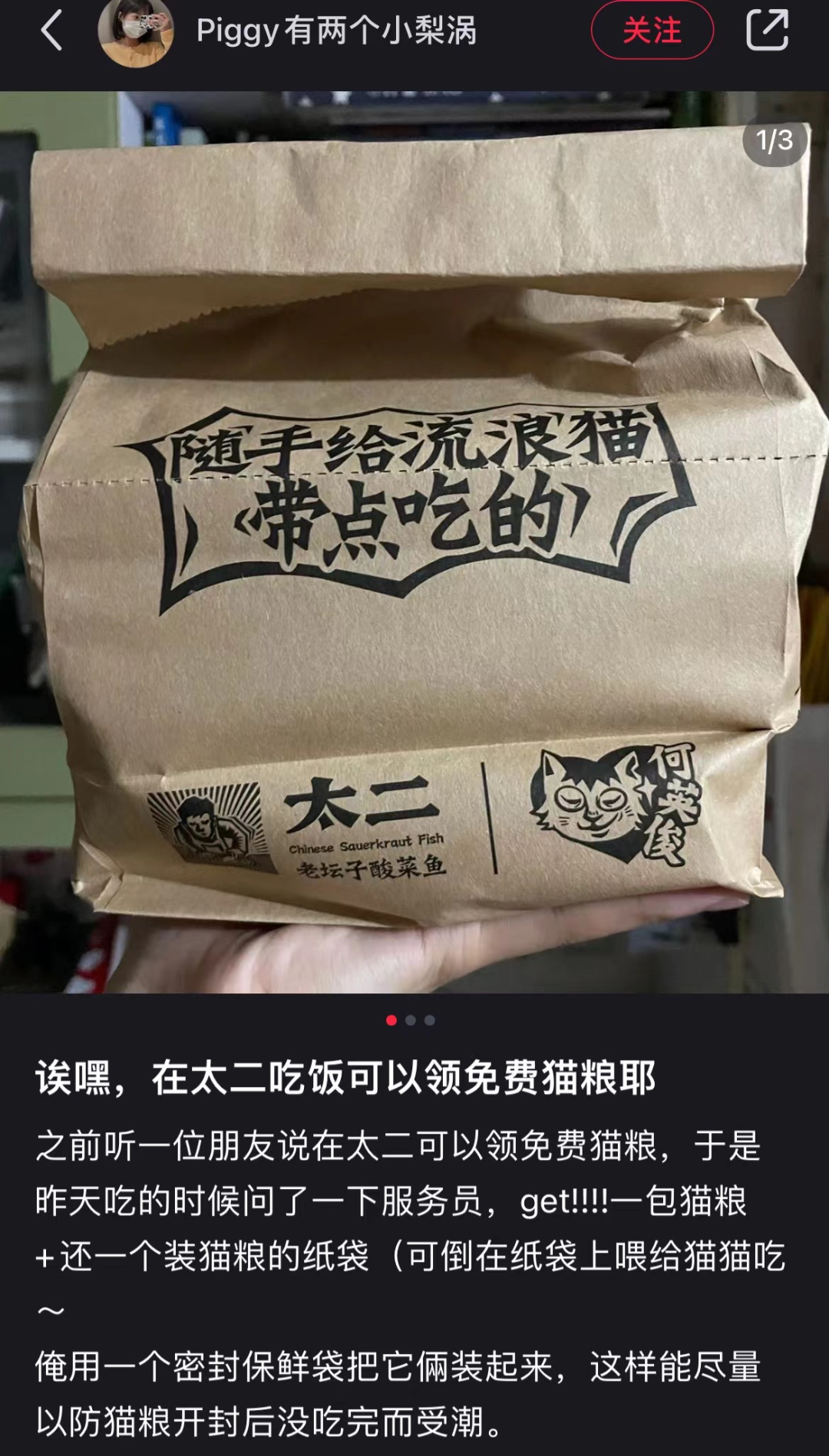 之前我们有说过太二用剩下的鱼骨做成猫粮让大家带走去喂流浪猫。这样的爱心举动,不仅让消费者切身加入保护动物的行列中,同时也能让消费者增添品牌好感度。