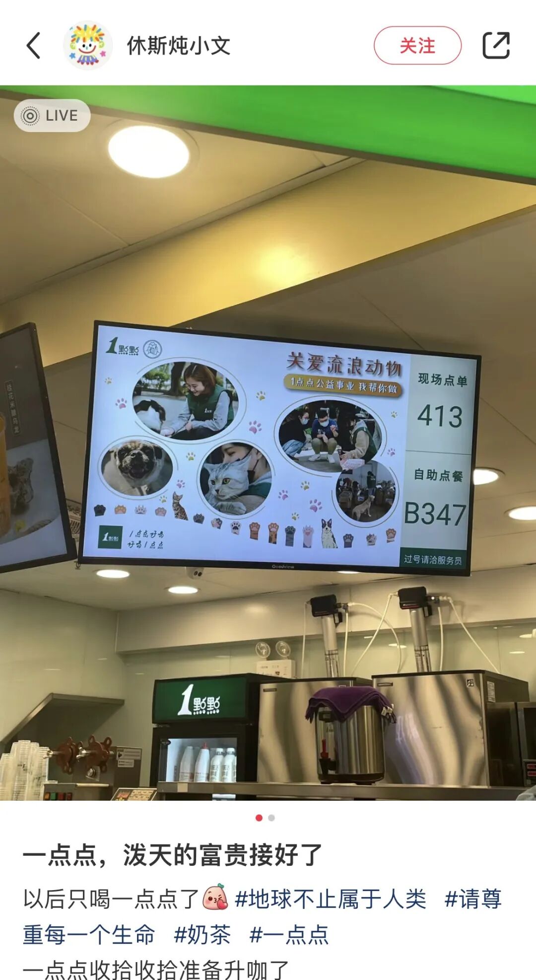 可以看到,一点点利用店内的点单屏进行关爱流浪动物的发声,希望通过自己的品牌力量向更多人传递爱心。