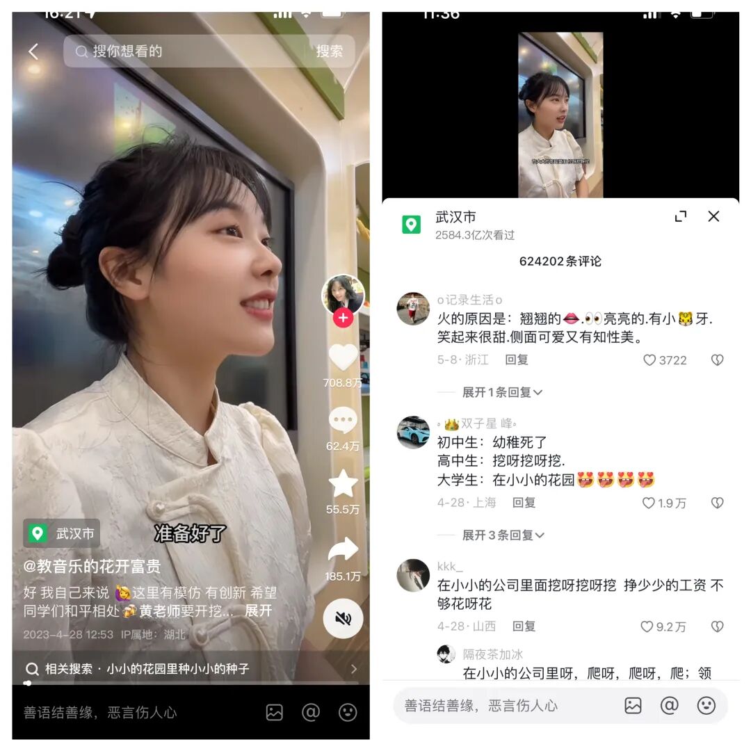 和@打工仔小张 一样,“挖呀挖”黄老师@教音乐的花开富贵 也是聚焦生活场景。当时,一句“在小小的花园里面,挖呀挖呀挖”成功洗脑众多网友,各种改编版本随之出现,打工人版“在小小的公司里面挖呀挖呀挖,挣少少的工资,不够花呀花”;大学生版“在小小的学校里面学呀学呀学,住小小的宿舍,和小小的床”……
