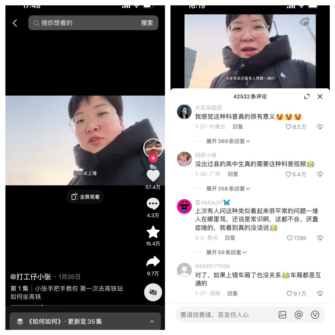 年初,凭借“第一次去高铁站如何坐高铁”这一视频,@打工仔小张 在抖音成功出圈。视频中她将坐高铁的全过程用手机详细记录了下来,从过安检到寻找自己的车厢座位,她提到诸多细节,这一科普视频获得超50万点赞。