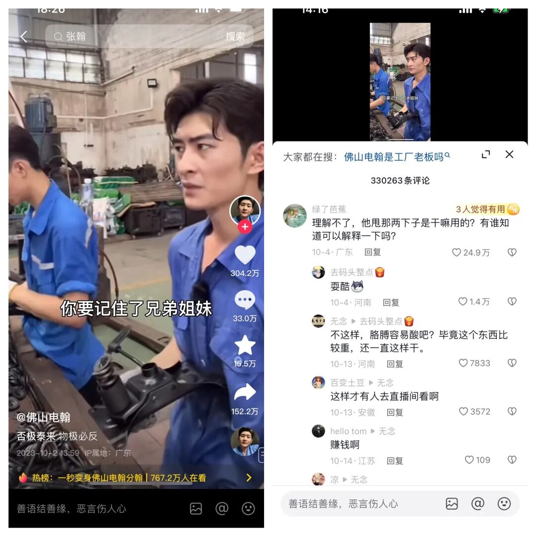 近期热度飙升的@佛山电翰 同样也是普通人生活的真实写照。翻看@佛山电翰 的出圈视频可以看到,他和工友一边打螺丝,一边说着“人生哲理”,整齐划一的动作再加上“电翰”严肃的表情,让整个视频的画风魔性十足。