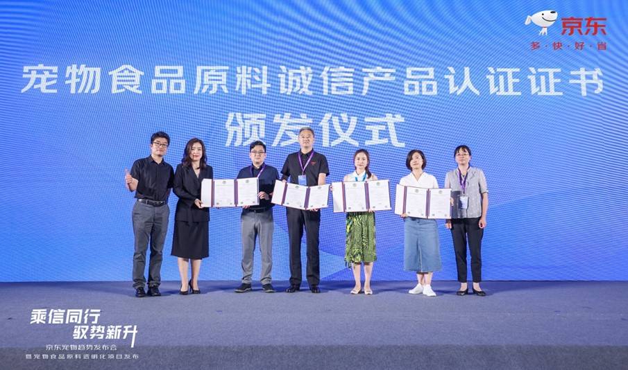 就拿最核心、最难做的原料诚信审核来讲,京东超市联合第三方认证机构北京华思联认证中心,打造行业首个“宠物食品原料诚信产品”认证标准,并对符合原料安全、用料真实、配方诚信、监督负责的宠物食品产品,授予原料诚信产品认证证书。在这个过程中,京东超市及第三方的检测几乎贯穿原料、配方、生产投料、包装、运输、销售等全部环节,确保消费者到手产品的质量。