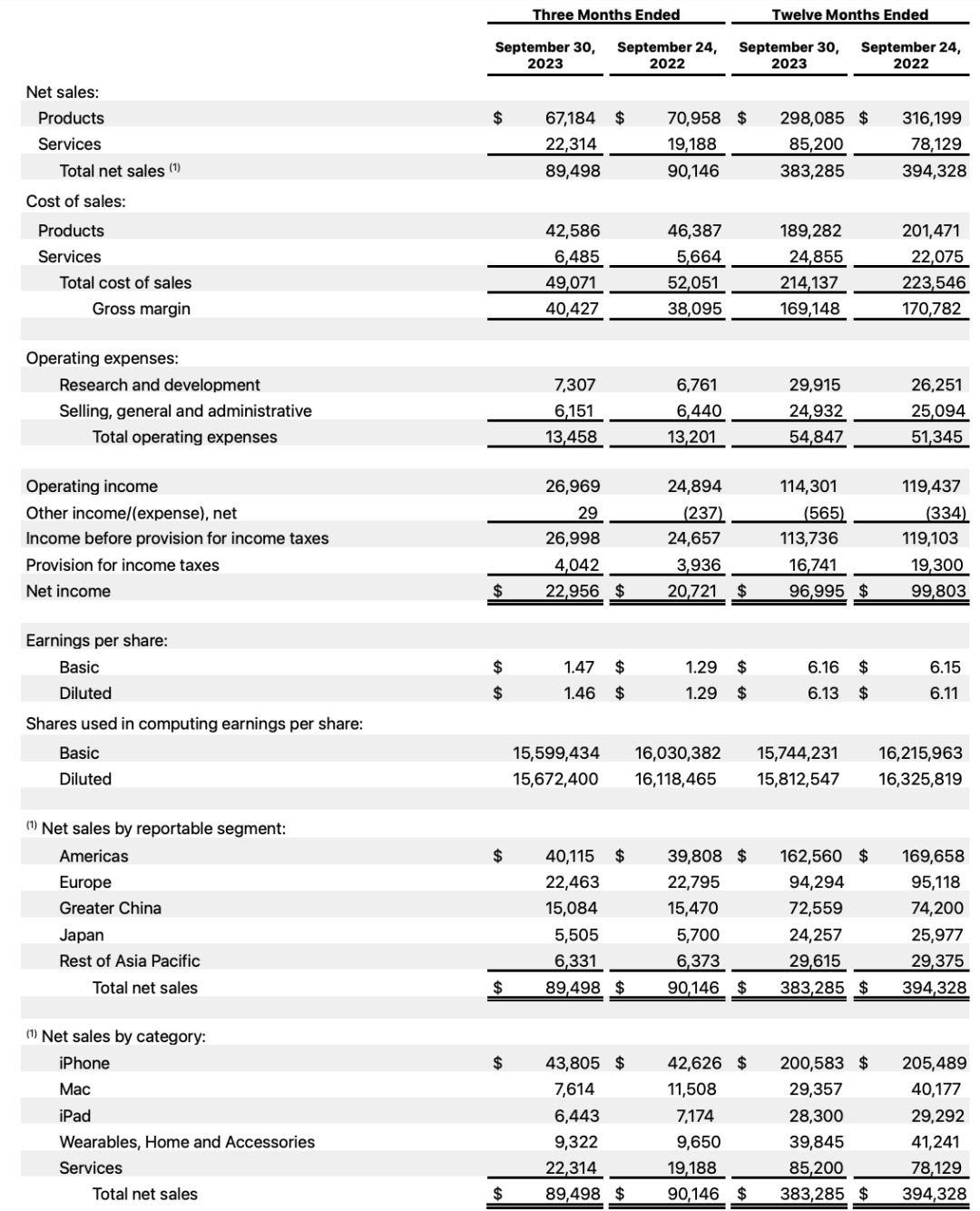 北京时间11月3日凌晨,苹果公布2023财年第四财季(即2023年第三季度)财报,该季度苹果营收895亿美元,同比下滑0.7%;净利润230亿美元,同比增长11.1%。这已经是苹果营收连续四个季度下降。