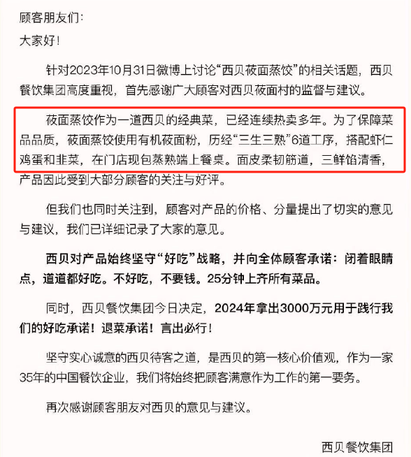 西贝这一波是在公关,不仅暴露出犯了花西子的错,还暴露出打广告的本质,试图强化“好吃”的核心利益点,来支撑“贵是因为好吃”。