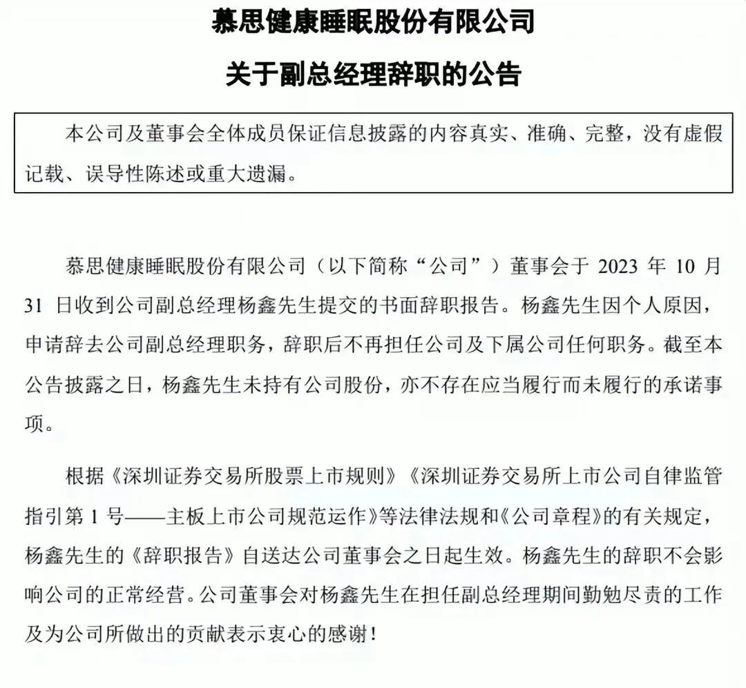 与此同时,慕思发布公告称副总经理杨鑫辞职,而网上传说他就是促成慕思与辛巴带货合作的操盘手。此时离职,未免过于巧合,有背锅之嫌。