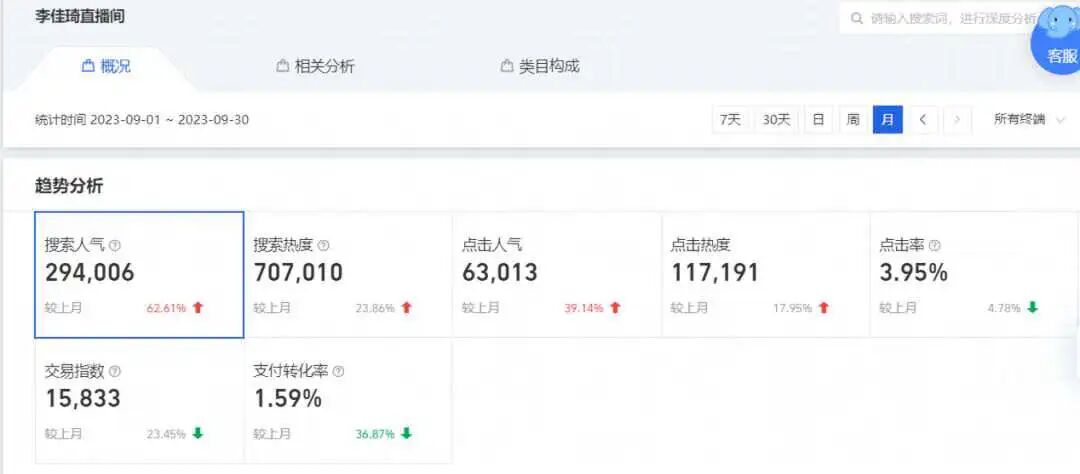 再加上近两个月,李佳琦各种争议缠身。花西子眉笔事件后,“生意参谋”分析数据显示,9月李佳琦直播间搜索分析的交易指数较8月下滑了23.45%,支付转化率更是跌了36.87%。