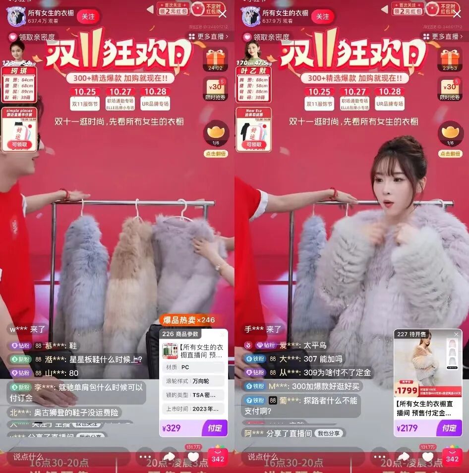 双11期间,“所有女生的衣橱”直播间更是取得了开门红。10月24日大促首日,“所有女生的衣橱”直播间由争气和苏畅出镜,4小时销售额破亿,战报显示整场直播观看人次达到1540万,销售额超过2.5亿元。