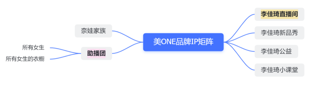 新榜编辑部统计了美ONE的品牌IP矩阵,一共包括6大板块,其中4个以李佳琦为核心,另外两个“奈娃家族”和助播团,也与李佳琦有着千丝万缕的联系,都是从李佳琦直播间走出。