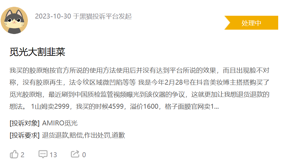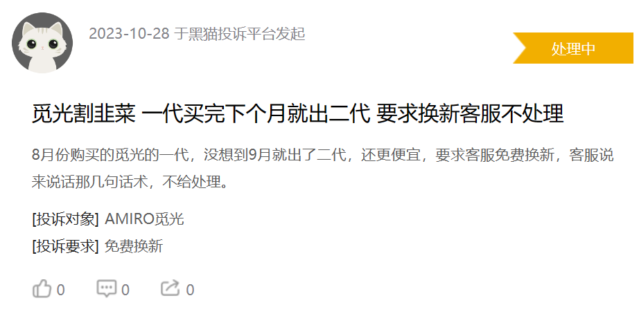 这些事件也进一步引发了消费者对于AMIRO觅光利用产品升级的信息差来定价的质疑。据黑猫投诉显示,有消费者投诉AMIRO觅光“山姆卖2999,我买的时候4599,溢价1600”“觅光割韭菜,一代买完下个月就出二代,要求换新客服不处理”。