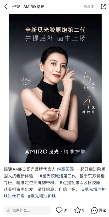 而到2023年6月,宗匠科技研发负责人曾在品牌文章中表示,经过上百次实验调整,发现电极并非越多越好,最终得到19极黄金点阵射频的最佳方案,宣称能让能量更深入,更聚焦。然而,仅时隔三个月,AMIRO觅光2023年在9月的发布会上推出胶原炮二代,宣称以48极黄金点阵射频打造面中“能量巅峰”,从而精准解决抗老问题。