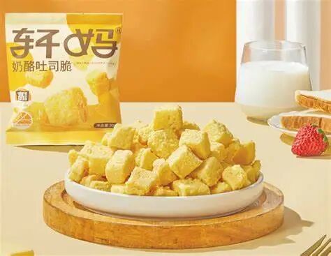 如轩妈推出的奶酪吐司脆,选用新西兰进口帕玛森干酪和切达芝士,特别加入安佳黄油和纯牛奶搅拌调和,保留了原制干酪浓郁咸香的同时也增添了芝士的柔和顺滑,嚼一嚼唇齿留香。