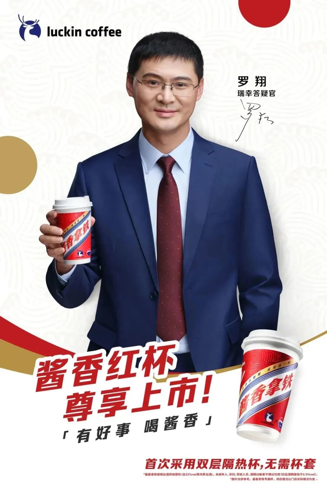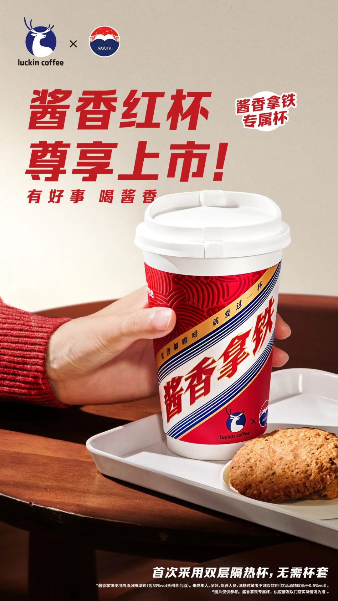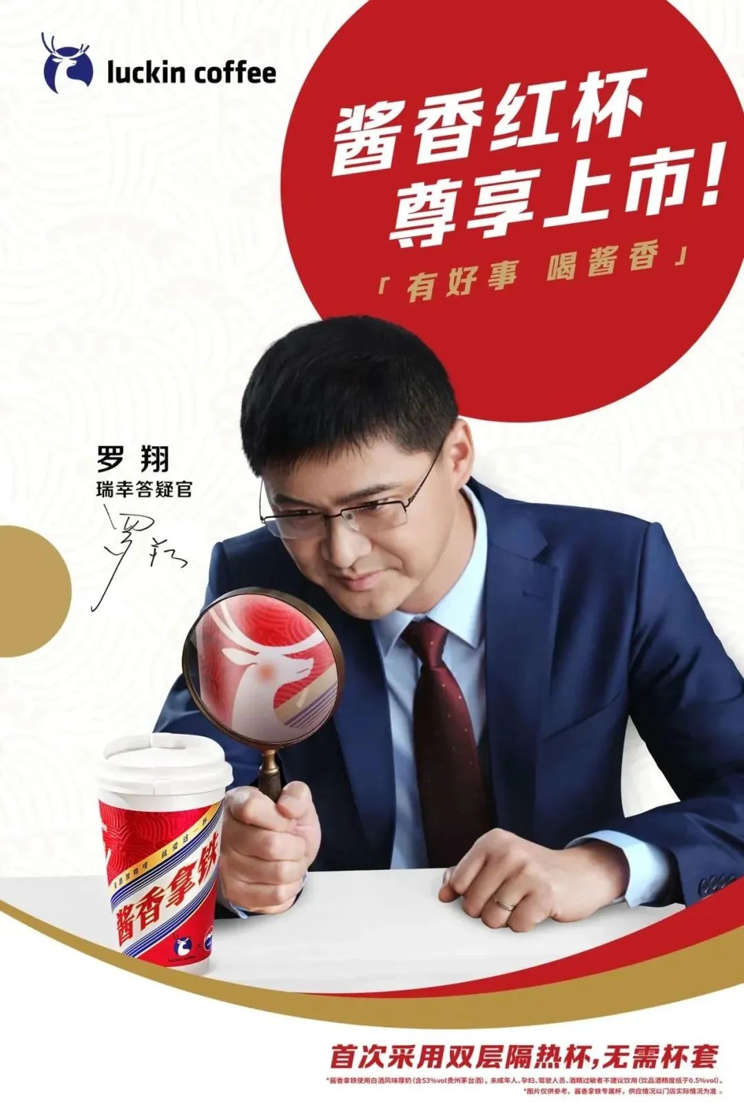 随着越来越多的咖啡品牌涌入到咖啡的赛道上,如今,咖啡行业进入存量市场,想要在红海市场中脱颖而出,品牌必须具备让消费者一眼认出的高辨识度,打造“视觉锤”。这就需要品牌选择更有影响力和区分度的传播符号,沉淀品牌资产。而火了两个月之久的“酱香拿铁”,无疑是爆款。“年轻人的第一口茅台,中年人的第一口咖啡”的热梗涌现,一个是白酒品牌的天花板,一瓶难求;一个是咖啡界的平价代表,两者联名形成了一种强烈的化学反应,瞬时引爆了热搜。瑞幸不光找罗翔担任答疑官,还洞察中国人「求好运」的心理,在冬天之际,推出专属“酱香红杯”。红杯表面增加了凹凸水纹纹理,触感更细腻,采用印金工艺,更显尊贵。这是瑞幸首款双层隔热杯,无需杯套,就能轻松露出茅台标志,成为“显眼杯”。“瑞幸蓝”与“茅台红”撞色的视觉冲击,搭配“酱香拿铁”“美酒加咖啡,就爱这一杯”等亮眼字体,完美演绎当下流行的国风美学。既符合年轻用户的时尚审美,又具备鲜明特质。更与入冬降温、年终氛围调性相合。新皮肤,新气象,酱香红杯专为喜报而生,瑞幸洞察年轻人消费的情感需求,为打工人专门打造了几种适合喝酱香红杯的场景,比如业绩创新高,“庆功酒”摆上;Q4冲刺提振士气,也值得喝一杯。