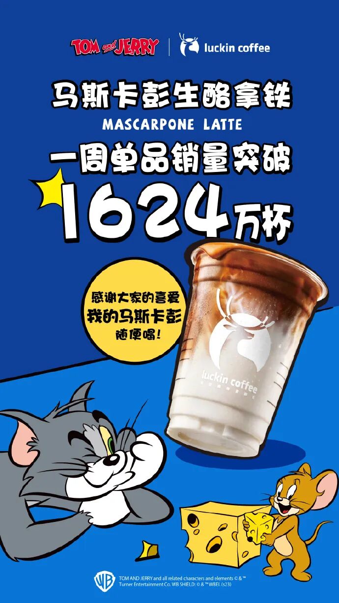 比如前段时间瑞幸与《猫和老鼠》IP联名推出的马斯卡彭生酪拿铁,一周单品销量突破1624万杯。