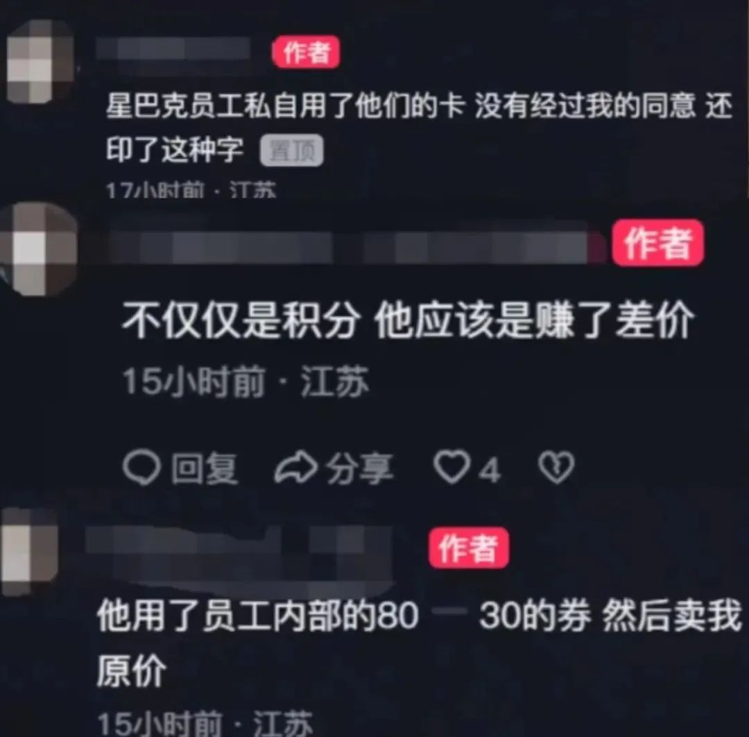 真相是,这杯咖啡确实是该女士点的,但“骚”是星巴克某店员的名字。根据该女士的说法,她当天本来只想点一杯星巴克,但店员告诉她,如果一次下单两杯饮品,可以获得一个免费的小蛋糕。她觉得很划算,就同意了对方的建议,花了58块钱买了两杯咖啡饮料,以及一个小蛋糕。然后,她就发现,其中一杯饮料的标签上出现了“骚”这个侮辱性字眼。她去找门店要解释,被店员告知,是店员给她用了“满80减30”的优惠券,用券时使用了某个店员的星巴克账号,而“骚”字就是那个店员的ID,自动生成在标签上了。随后,该门店收回了那杯饮品并倒掉,还重新给她升级制作了一份超大杯的饮料。让该女士一脸懵逼的是,她下单的时候,并没有被告知使用任何优惠券。而且,门店店员看似好心地用优惠券让她享受到了福利,但店员用自己的账号下单,其实也有蹭顾客积分的嫌疑。也就是说,钱是顾客花的,积分是店员积的,消费者被反向薅了羊毛。甚至,该女士还质疑,店员是用了员工的内部优惠券,将咖啡以原价卖给自己,她们自己从中赚差价。