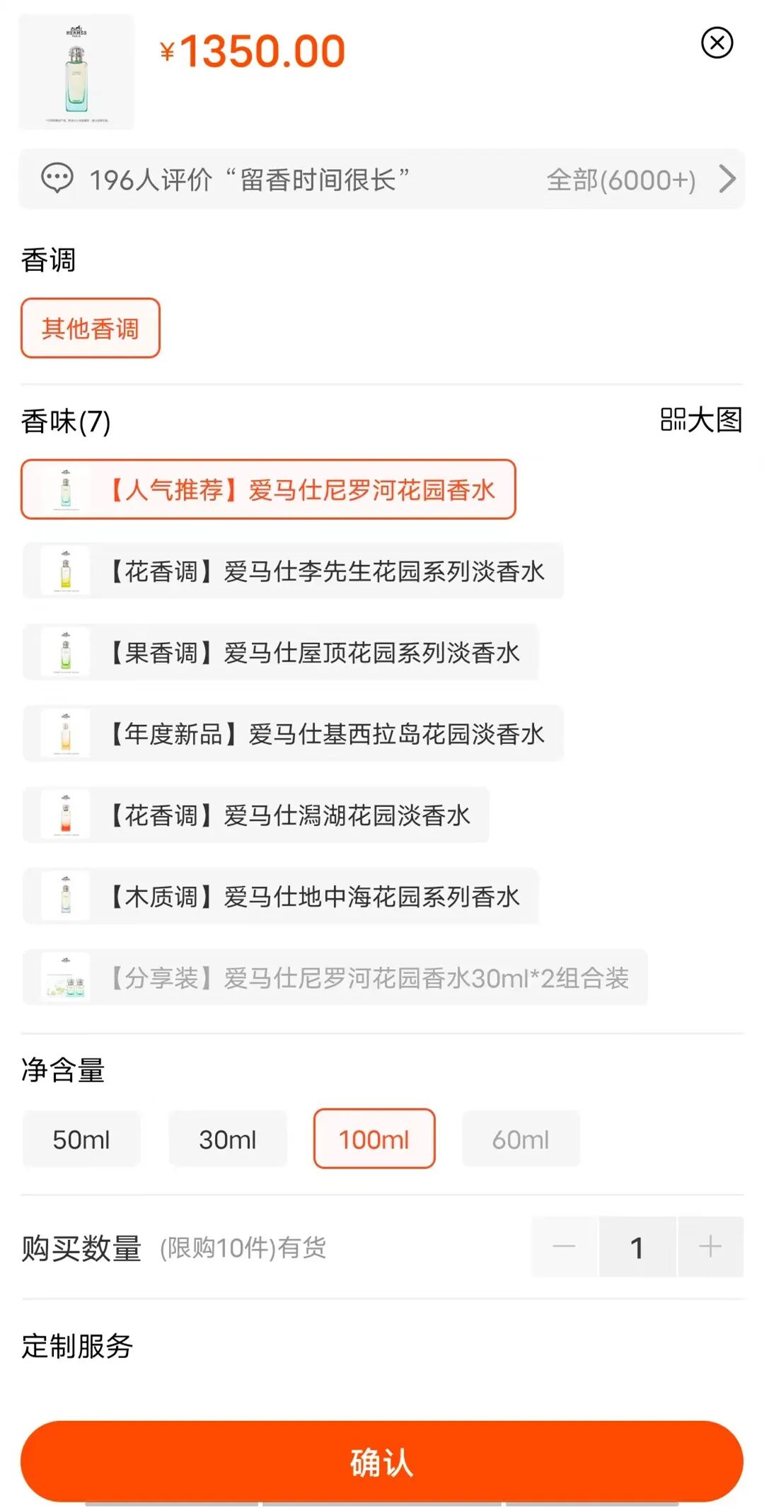爱马仕尼罗河花园香水,100ml卖1350元,比它量大还便宜。