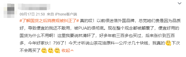 从上一次李佳琦翻车的后续效应,其实也能看出来,越来越多的消费者开始对涨价的国货品牌不满,不然也不会把花西子拉去跟金价比,吐槽薇诺娜火了就飘了。