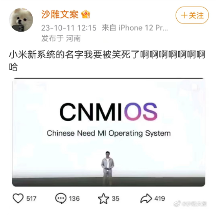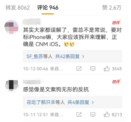 简洁明了确实像小米设计风格,该系统名称很快便引起网友讨论。评论区直接就炸锅了,比如有人直接给出了清晰解释:其实大家都误解了,雷总不是常说,要对标iPhone嘛,大家应该拆开来理解,正确是CNM iOS(草泥马IOS)。