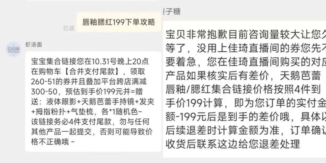 “我今年买了花知晓的口红和腮红,按照主播给出的机制是4件券后199元,且主播还建议付尾款时,最好只付这4个产品,否则拼单后可能会影响低价。”雨辰介绍道,“但因为忘记去领品牌券,最终没享受到‘史低’,还好花知晓表示最后会退差价,否则我真的可能会整单退款。”