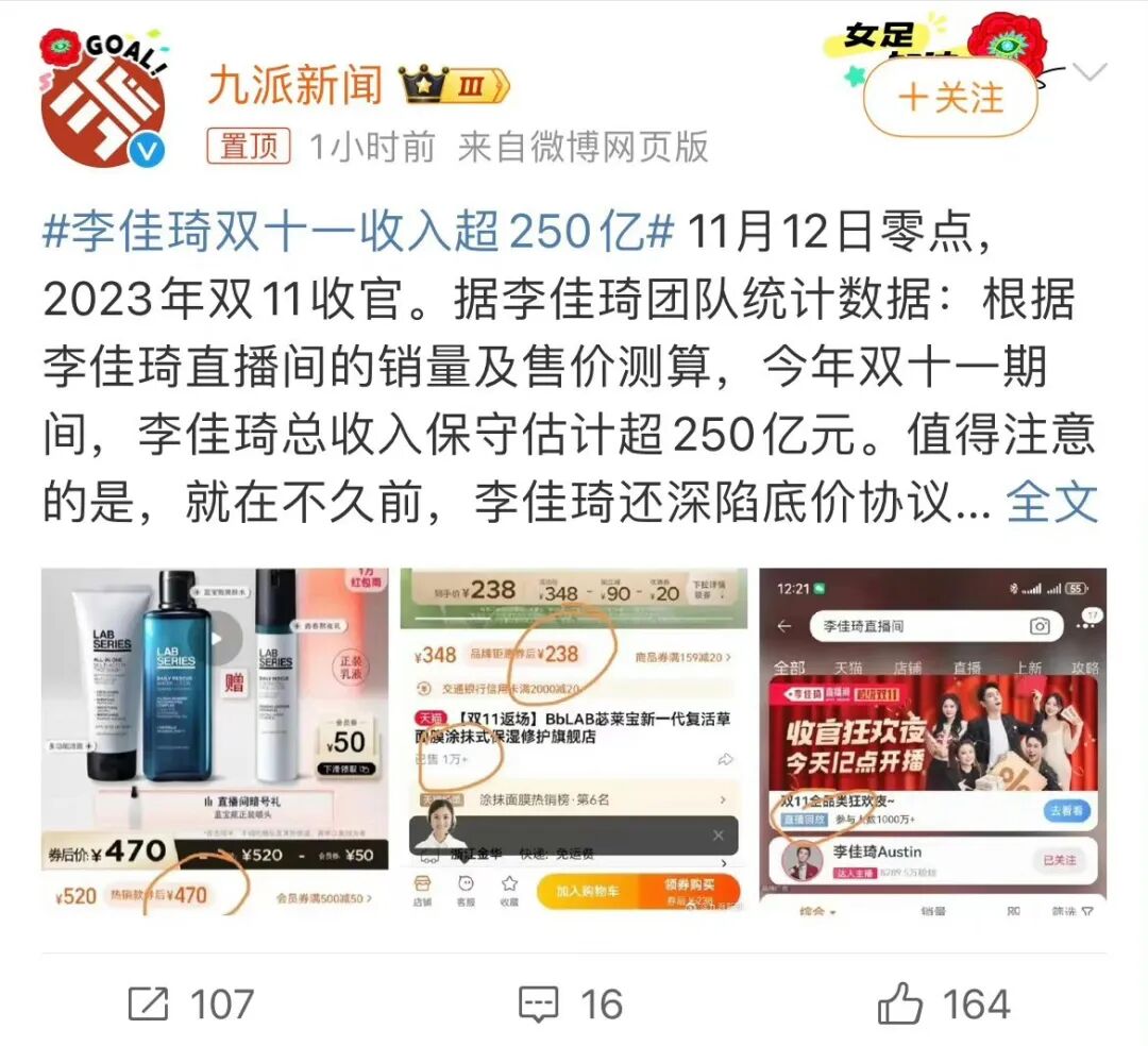 先说顶流中的顶流、头部中的头部——李佳琦。昨天一早,九派新闻便爆料,李佳琦双11期间带货收入“保守估计超250亿”;
