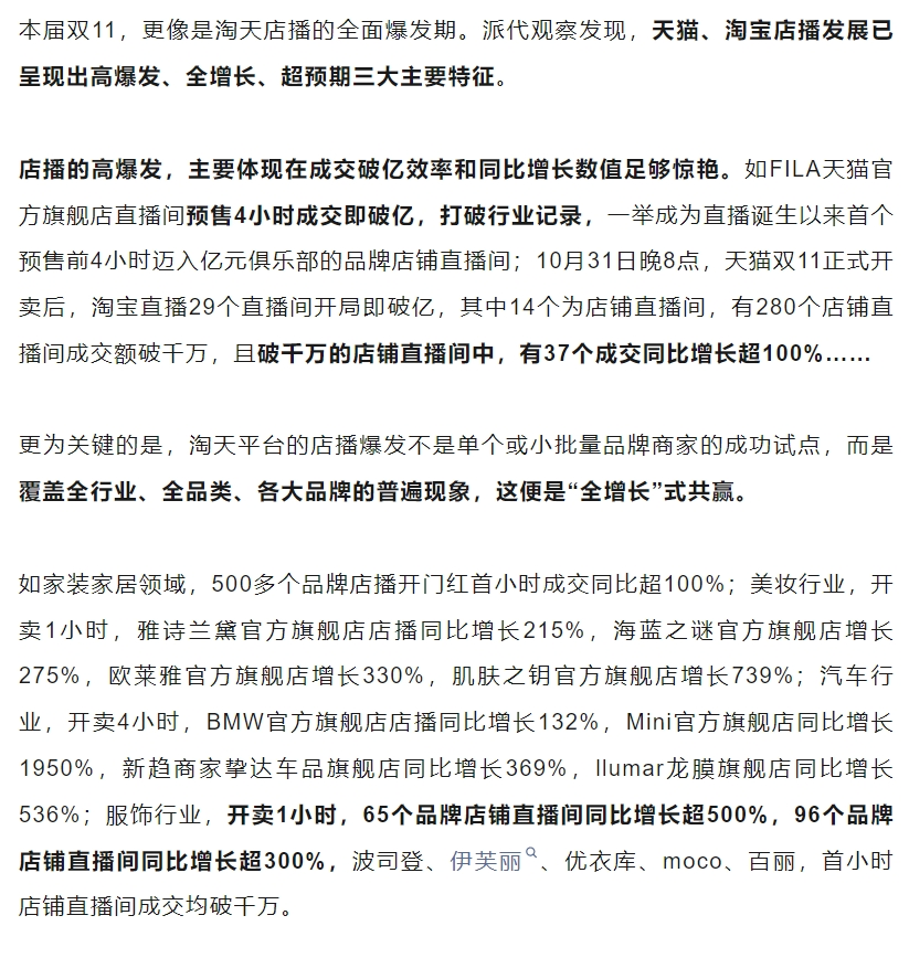 相较之下,淘天公关已经放出风声,今年双十一店播迎来爆发式增长。据说,家装家居、美妆、汽车、服饰等行业,数以百计的品牌店播都是翻倍式的业绩增长。