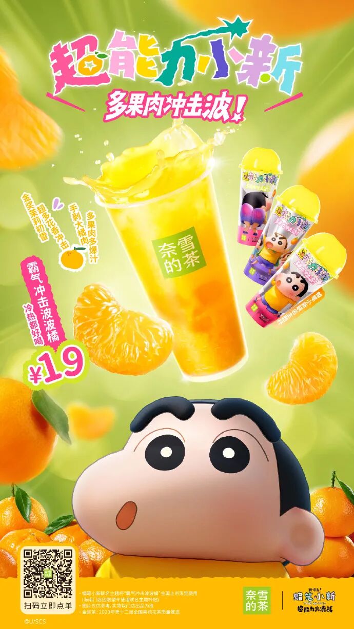 开个玩笑,他来了他来了,奈雪的茶带着“污王”蜡笔小新向我们走过来了。那个扭动着屁股,喜欢漂亮大姐姐,被称为岛国最污的熊孩子,温暖过多少人的童年。记得小时候,电视播放的《蜡笔小新》每次开场总会弹出“家长指引,敬请家长留意”,现在回过神来才知道原来这么“污童年”。虽然《蜡笔小新》就像老司机杜蕾斯,一言不合就飙车,但阻挡不了这个经典动画IP的高人气,大众认知度依旧强势。最近,奈雪的茶官宣与蜡笔小新联名,推出「霸气冲击波波橘」,发射超能力小新多果肉冲击波,唤醒大家的童年。